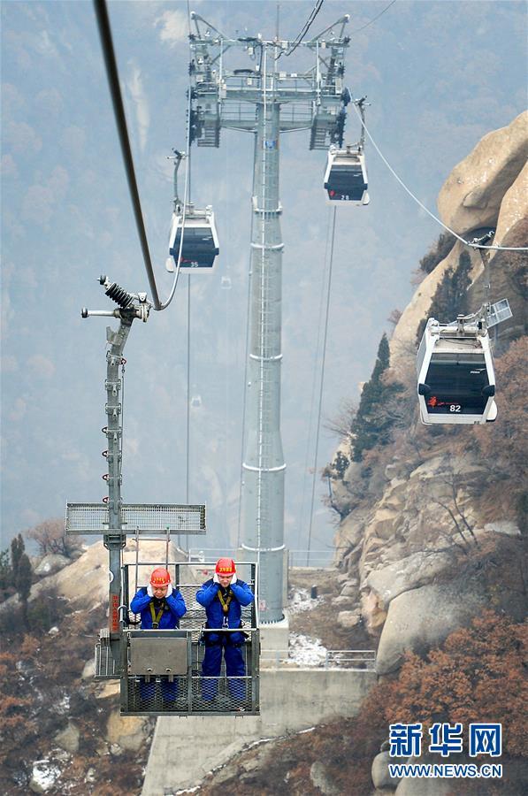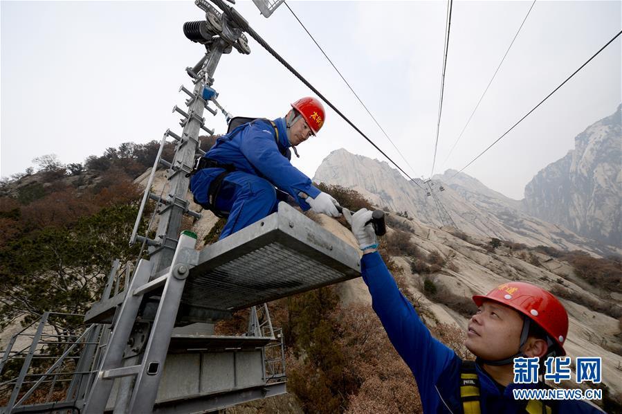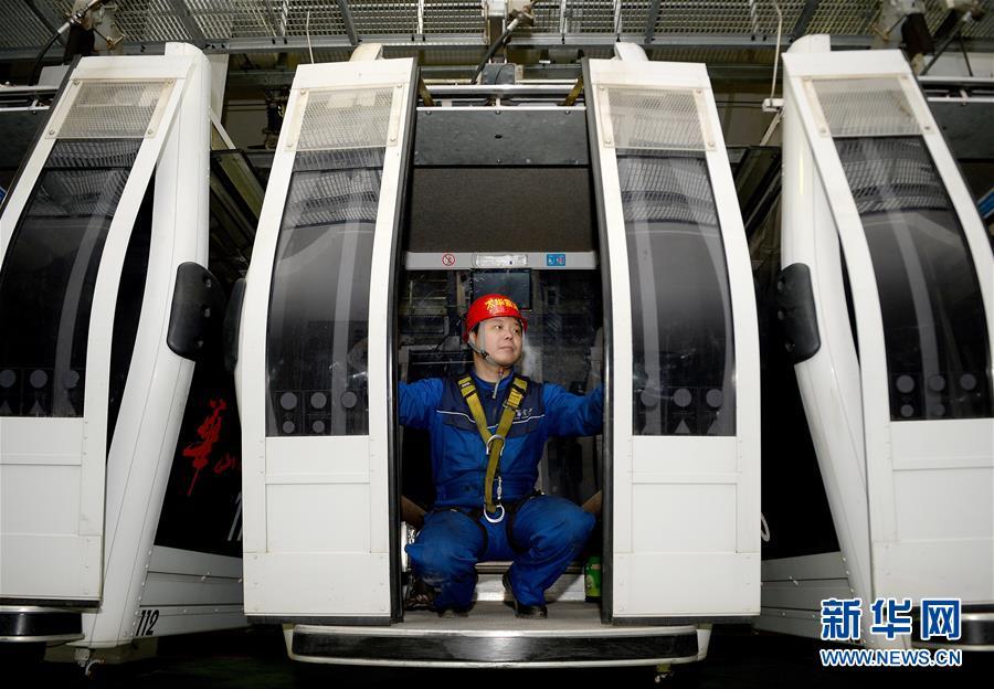 梁斌回忆,“刚开始爬支架时老师傅带着上,到了架子上非常害怕,都不知道怎么下去,但是爬的次数多了,很多时候还要晚上爬,不知不觉也就不怕了。” 从太华索道运营开始,张新建和梁斌就做着检修工作,几年下来,除了练大了胆量,更学会了细心。张新建说:“我们的工作关系着千万人的安危,把手里的工作做好,把每位游客安全送到山上山下,是我和其他索道检修兄弟们最大的心愿!” 新华社记者 刘潇 摄