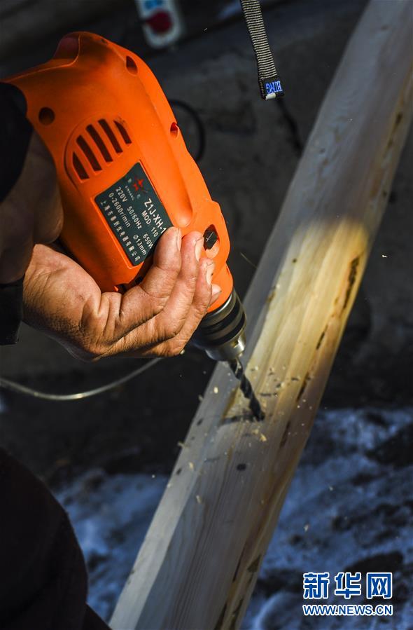 在新疆布尔津县禾木村的一处冬季牧场,森格尔在制作毛皮滑雪板时在木材上钻孔(1月3日摄)。新华社记者 胡虎虎 摄