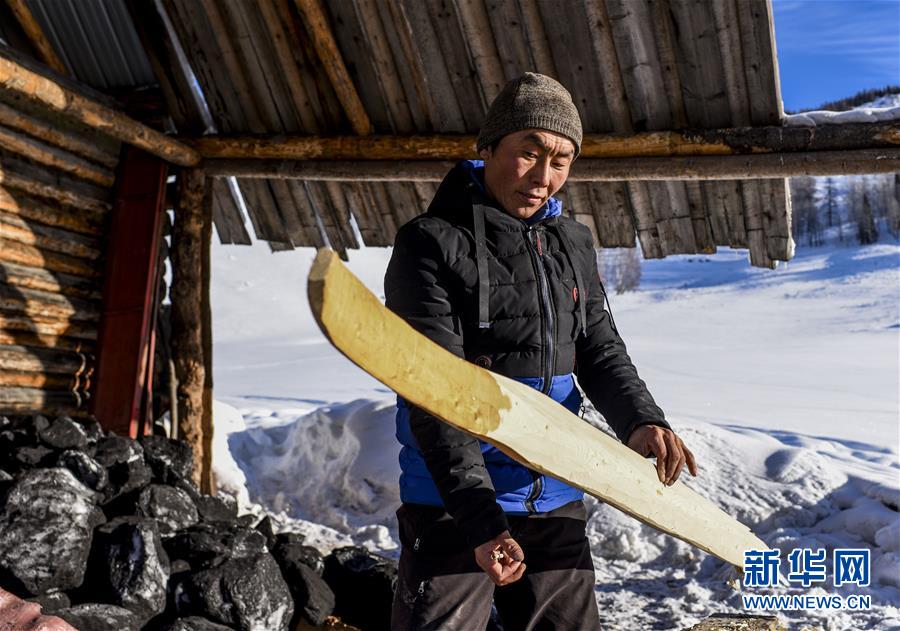 在新疆布尔津县禾木村的一处冬季牧场,森格尔在制作毛皮滑雪板时检查滑雪板的平面(1月3日摄)。新华社记者 胡虎虎 摄