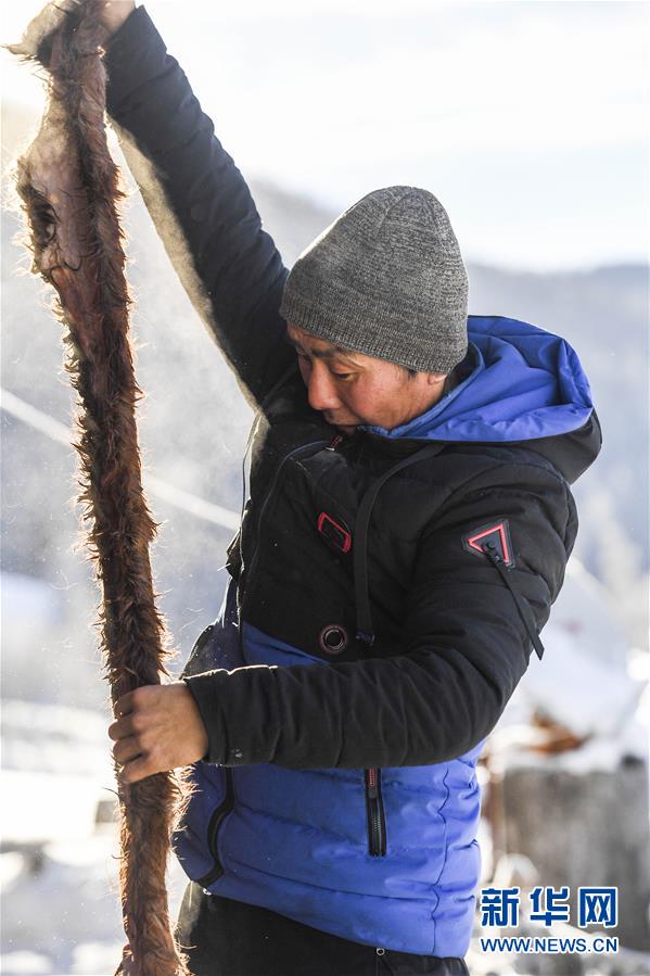 在新疆布尔津县禾木村的一处冬季牧场,森格尔在挑选马小腿部位的毛皮,用于制作毛皮滑雪板(1月3日摄)。新华社记者 胡虎虎 摄