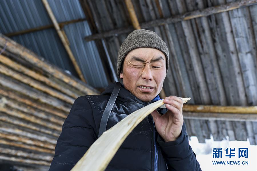 在新疆布尔津县禾木村的一处冬季牧场,森格尔在制作毛皮滑雪板时检查滑雪板的平面(1月3日摄)。新华社记者 胡虎虎 摄