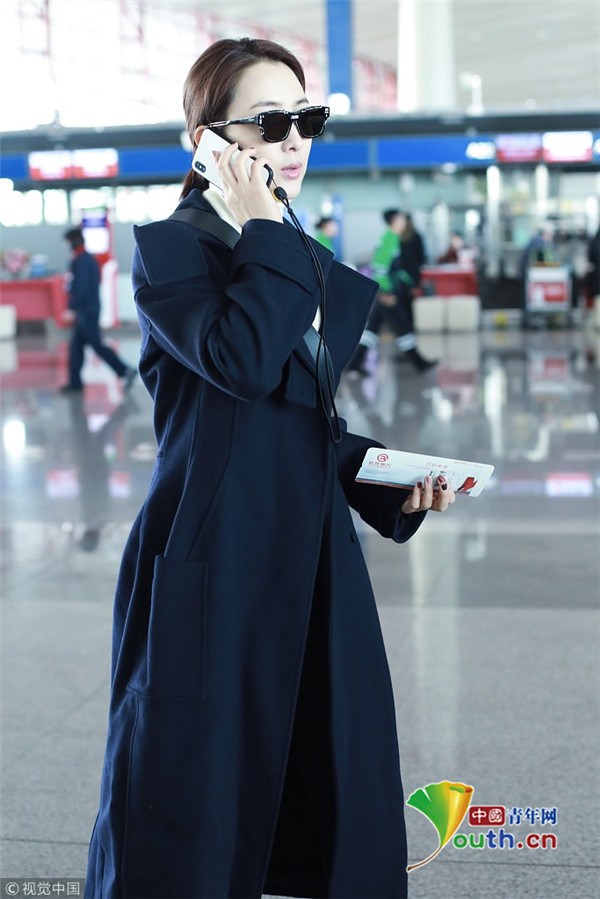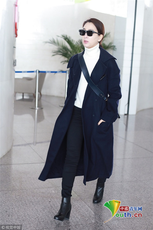 2019年1月7日,北京,马苏现身机场。她身穿黑色到脚大衣霸气外露,架黑超涂红唇似帅气“女特工”。