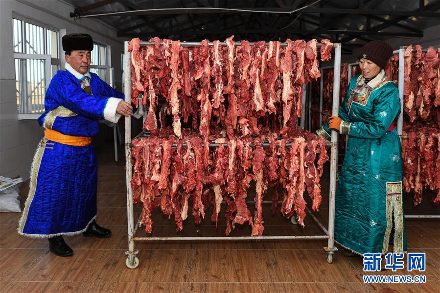 1月9日,牧民伊拉代(左)和妻子斯琴高娃在风干室内摆放挂满牛肉的铁架。