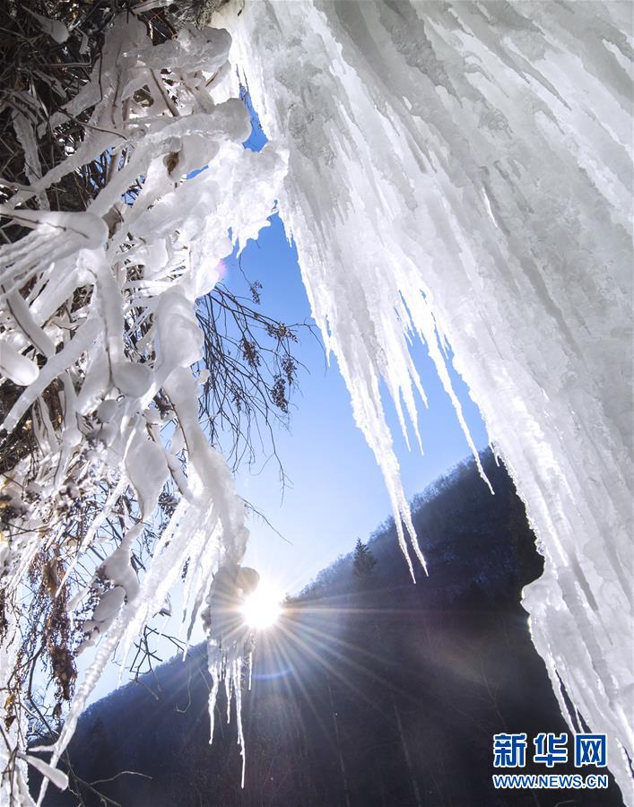 这是在吉林省长白县十五道沟望天鹅景区拍摄的悬于石壁间的冰凌(1月3日摄)。新华社记者许畅摄