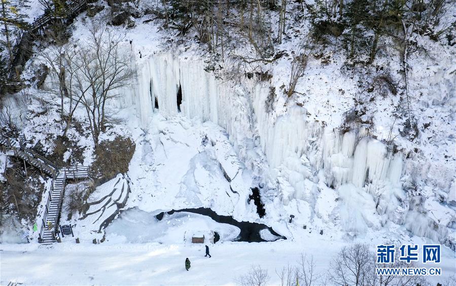 游人在吉林省长白县十五道沟望天鹅景区观赏冰瀑景观(1月3日无人机拍摄)。新华社记者许畅摄