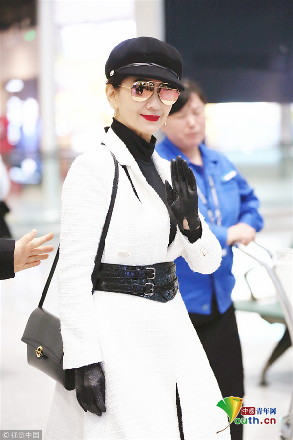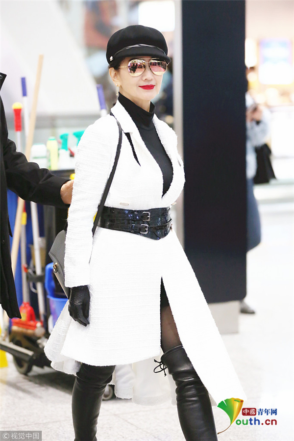 1月10日,广东省深圳市,赵雅芝夫妇现身深圳宝安机场,头戴贝雷帽的她架着反光墨镜,一袭白色不规则连衣裙配上黑色腰封及皮靴,酷似甜美女教官!