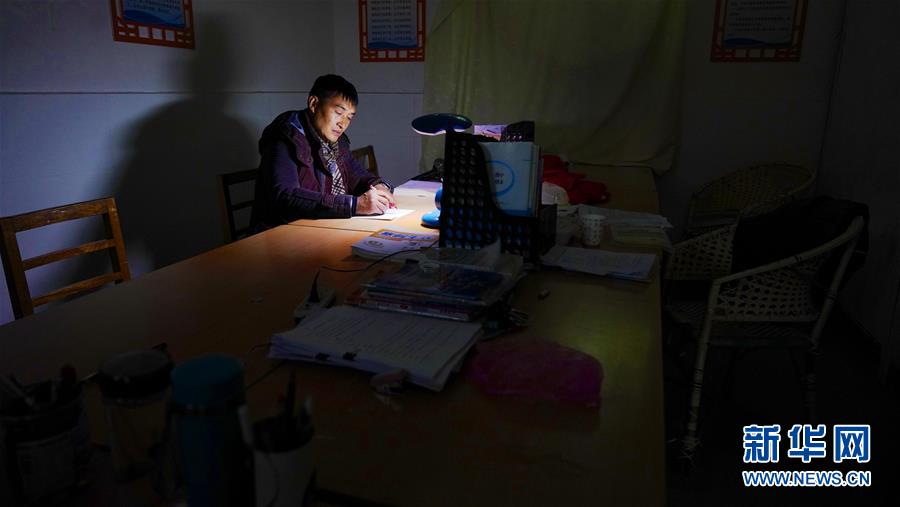 1月4日,学生们和老师都走后,章站亮在学校的办公室内备课。 新华社记者 胡晨欢 摄