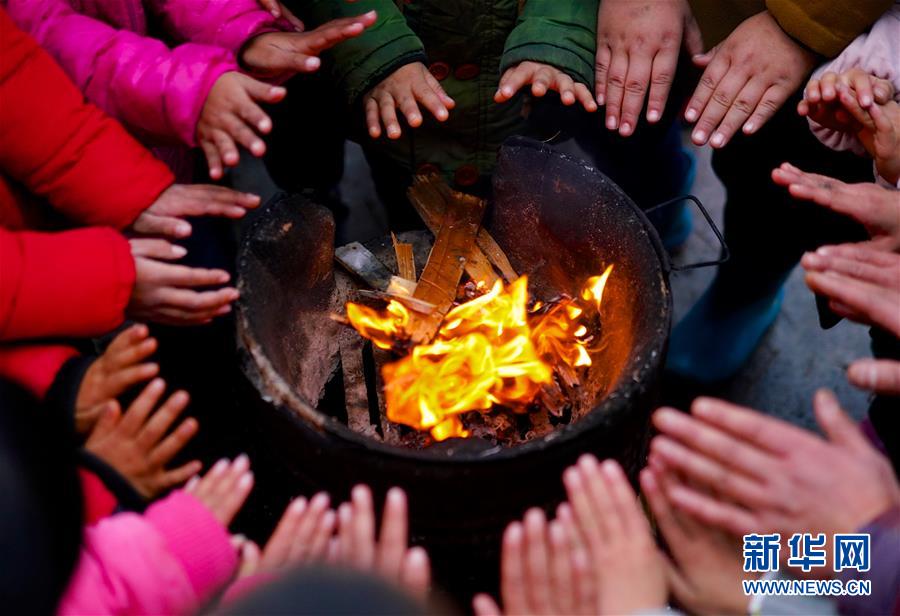 1月3日,章站亮和学生们一起围着点燃的火炉取暖。 新华社记者 胡晨欢 摄
