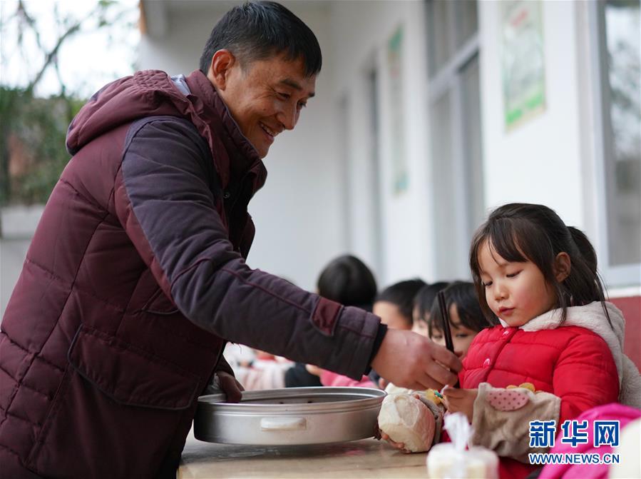 1月3日,烧完饭菜后,章站亮(左)给一位学生递送用餐的筷子。 新华社记者 胡晨欢 摄
