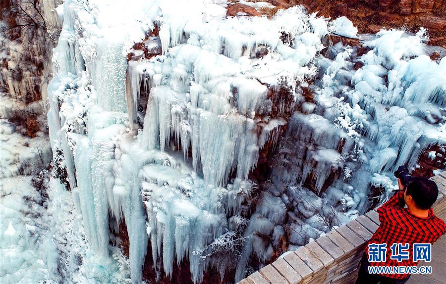 近日,河北省涉县太行五指山景区出现冰瀑景观,吸引众多游客到此观赏。