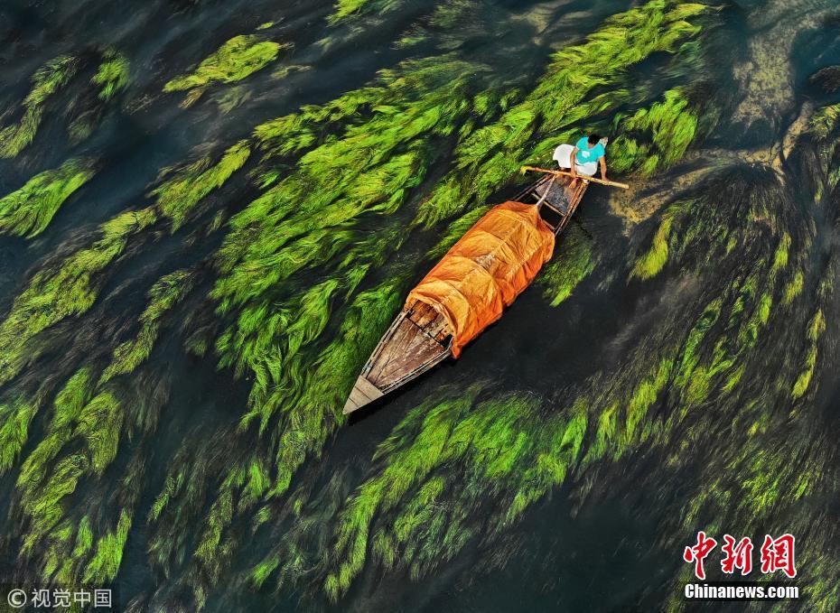 中国新闻网1月14日讯(具体拍摄时间不详),孟加拉国乌拉帕拉,渔船在水流和藻类的映衬下前行,画面看起来就像水彩画一般。图片来源:视觉中国