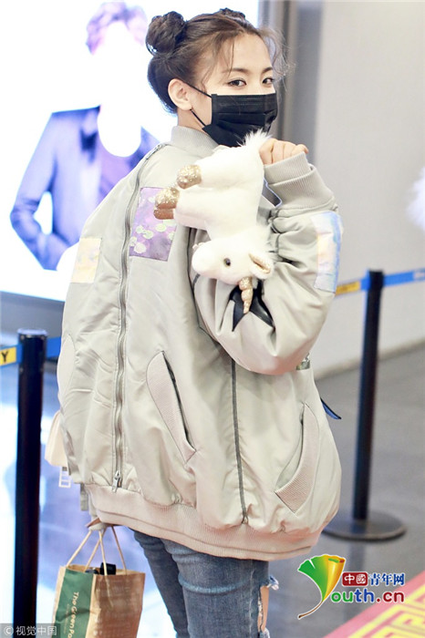 2019年1月14日,北京,杨超越现身机场。她扎哪吒头活力十足,甩玩偶淘气回眸,穿破洞裤露美腿,披面包服似自带鼓风机。