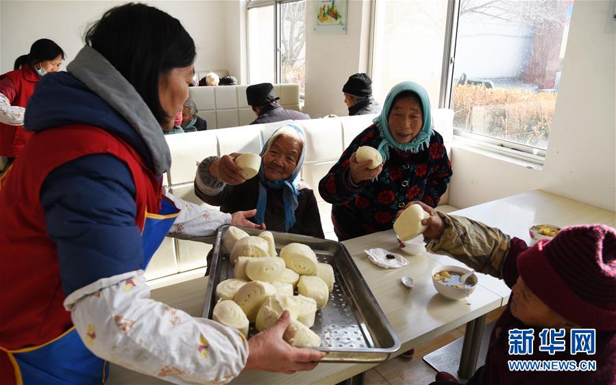 1月15日,村里的志愿者为就餐的老人分发馒头。新华社记者王凯摄