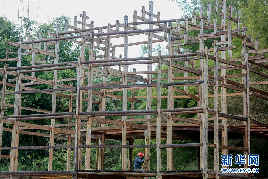 1月15日,在广西融水苗族自治县融水镇梦呜苗寨,工人在吊脚楼的主要结构上施工。新华社记者 陈君清 摄