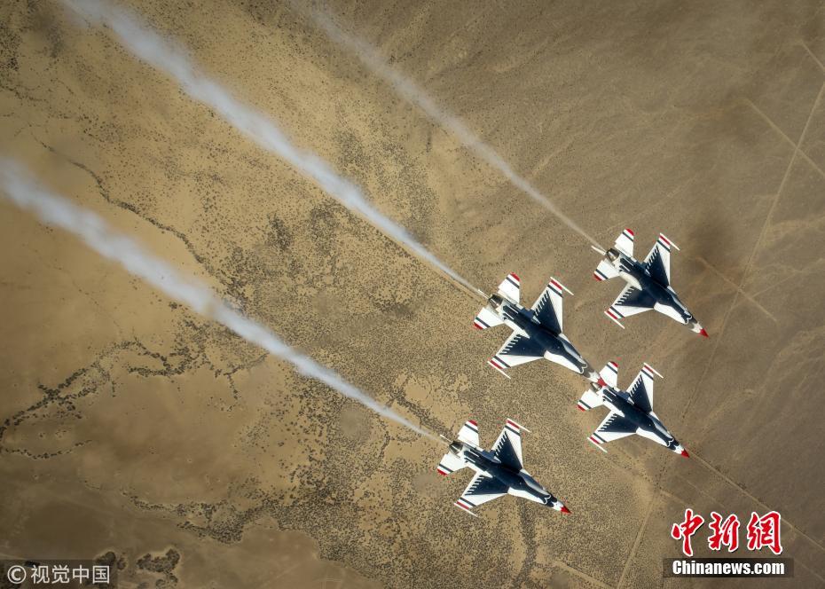 日前,美国军队官方出版社《Airman》杂志评选出2018年度最具震撼力的美国空军照片。图为美国内华达州,美国空军雷鸟钻石编队的飞行员进行训练飞行。图片来源:视觉中国