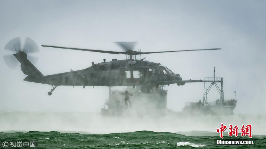 日前,美国军队官方出版社《Airman》杂志评选出2018年度最具震撼力的美国空军照片。图为在美国佛罗里达迈阿密海滩举行的第二届“致敬美国英雄”的海空表演中,空军预备役920救援联队一名伞兵从HH-60G Pave Hawk直升机上跳下。图片来源:视觉中国