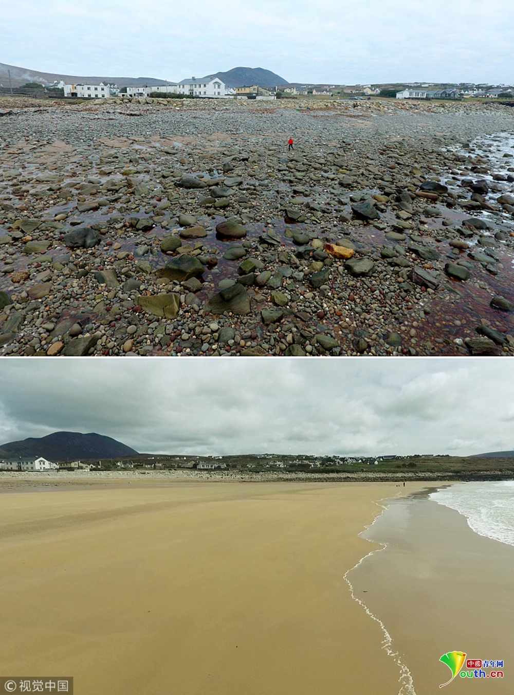 中国青年网2019年1月15日讯(具体拍摄时间不详),爱尔兰阿基尔岛,Dooagh地带的黄金海滩在1984年的一场暴风雨后神秘消失,但在2017年4月,消失了33年的海滩又奇迹般地重现。