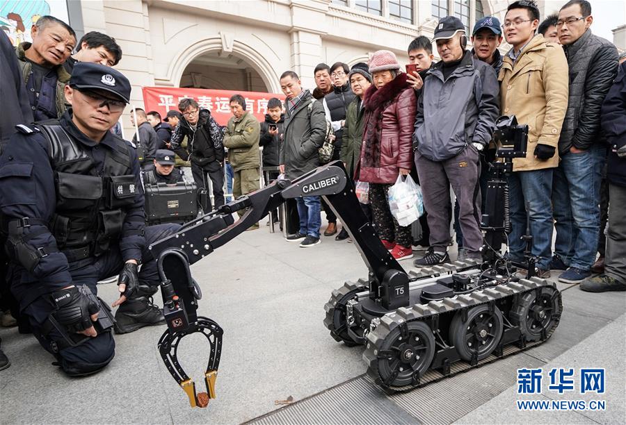 1月16日,旅客们在观看警用排爆机器人演示。 当日,武汉铁路公安处在汉口火车站举行警营开放日活动,让旅客零距离接触警务安全工作,营造良好的春运出行环境。 新华社记者程敏摄