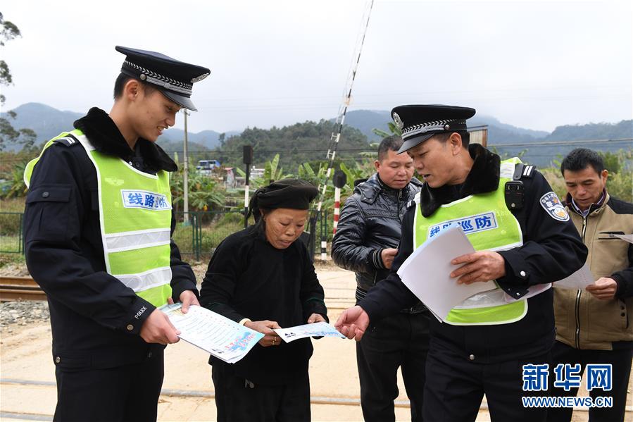 铁路公安民警陆日峰(前排右一)和同事在中越边境巡线时给铁路沿线的群众发放安全宣传单(2018年12月31日摄)。 新华社记者陆波岸摄