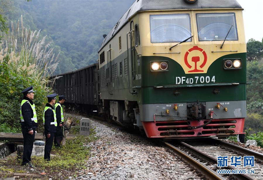铁路公安民警陆日峰(左一)和同事目送着一列火车通过湘桂线铁路终点从越南进入中国(2018年12月31日摄)。新华社记者陆波岸摄