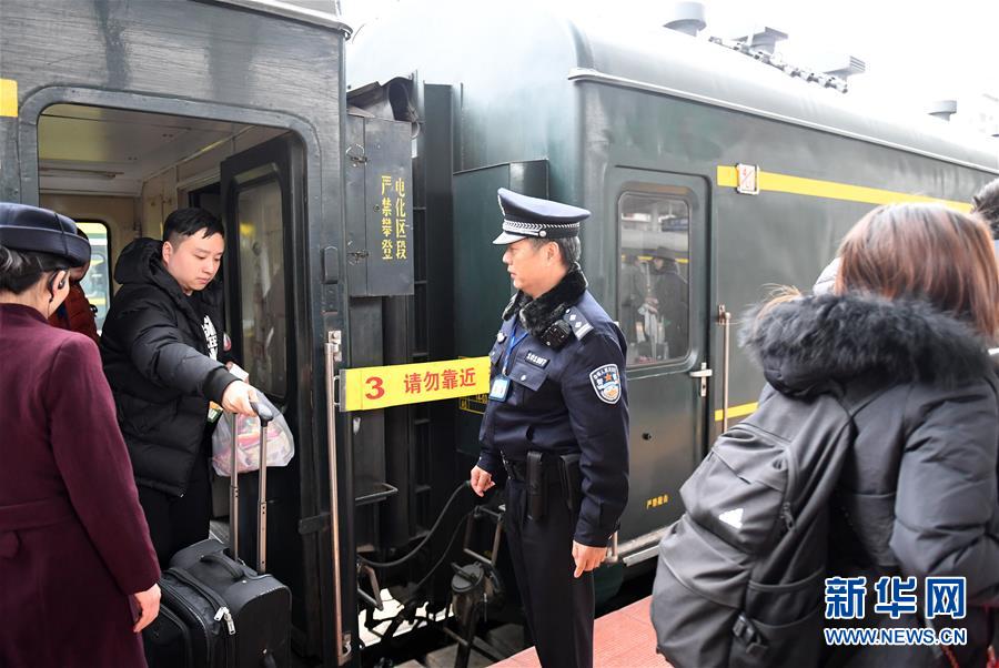 1月1日,在广西南宁火车站,乘警杨铁鸣在从越南河内(嘉林)开往中国南宁列车旁值勤。 新华社记者陆波岸摄