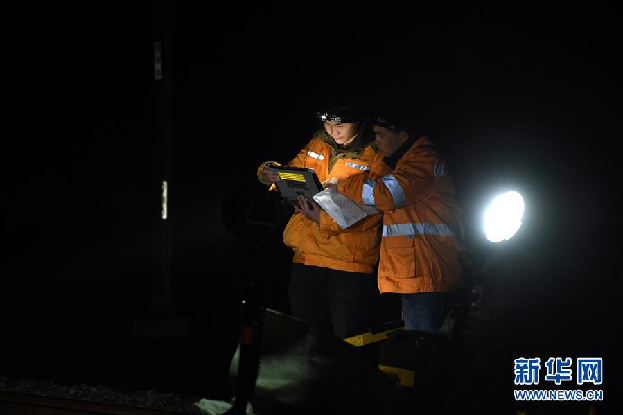 1月17日,绩溪北综合维修工区高铁线路工在复核测量数据。新华社记者刘军喜摄