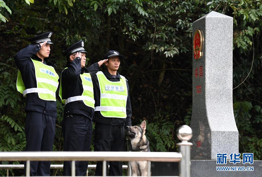 铁路公安民警陆日峰(左二)和同事在中越边境巡线时向界碑敬礼(2018年12月31日摄)。 新华社记者陆波岸摄