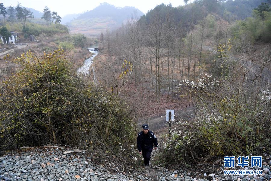 1月16日,汪茂才在巡线途中。 今年52岁的汪茂才是合肥铁路公安处黄山站派出所歙县警务室的一名线路民警,他所在的警务室负责皖南山区皖赣铁路线约80公里范围内的线路安全。从警30年来,线路巡查、铁路安全知识宣传等是汪茂才的日常工作。多年来的徒步巡线,让汪茂才练就了一双快腿,十公里的路,汪茂才两个小时就能走完。 汪茂才负责的铁路沿线周边村庄较多,很多房子都是沿铁路线而建,有些村民为了图方便,违规穿越铁路线。加强对铁路沿线居民的安全宣传教育,成为汪茂才的一项重要工作,沿线村民的安全意识也越来越高。 对汪茂才这样的线路民警来说,大多数时候都是“独行侠”,“当线路民警就要耐得住寂寞,守得住孤独,与大山为伴,与线路为友,尽己所能,为铁路安全运行保驾护航。”汪茂才说。 新华社记者刘军喜摄