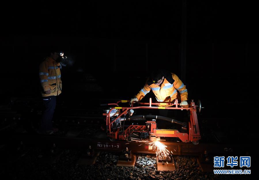 1月17日,绩溪北综合维修工区高铁线路工在打磨钢轨。新华社记者刘军喜摄