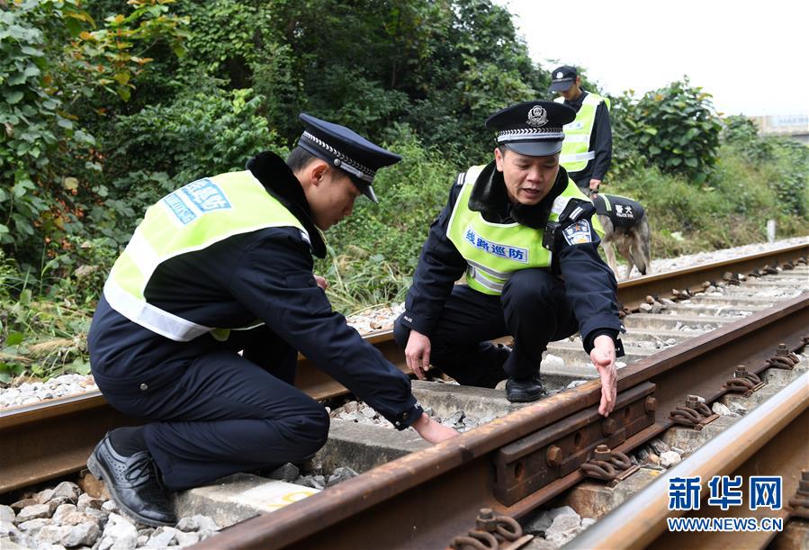 铁路公安民警陆日峰(左二)和同事在中越边境巡线时检查铁轨情况(2018年12月31日摄)。 新华社记者陆波岸摄