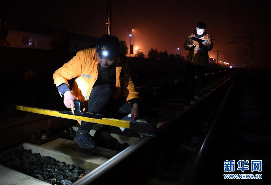 1月17日,绩溪北综合维修工区高铁线路工在检查线路设备。新华社记者刘军喜摄