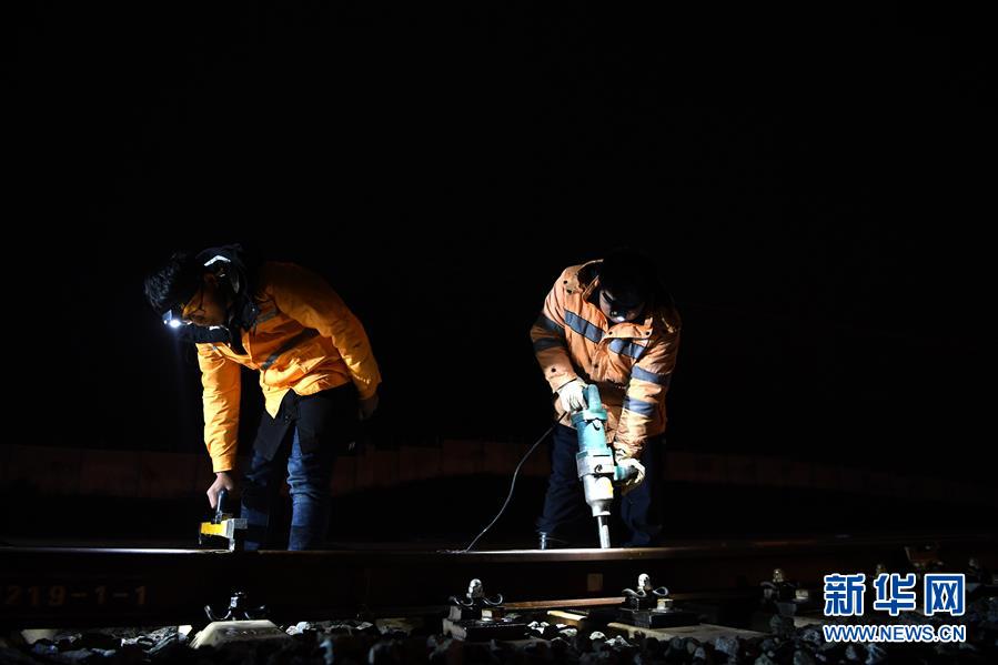 1月17日,绩溪北综合维修工区高铁线路工在紧固螺栓。新华社记者刘军喜摄