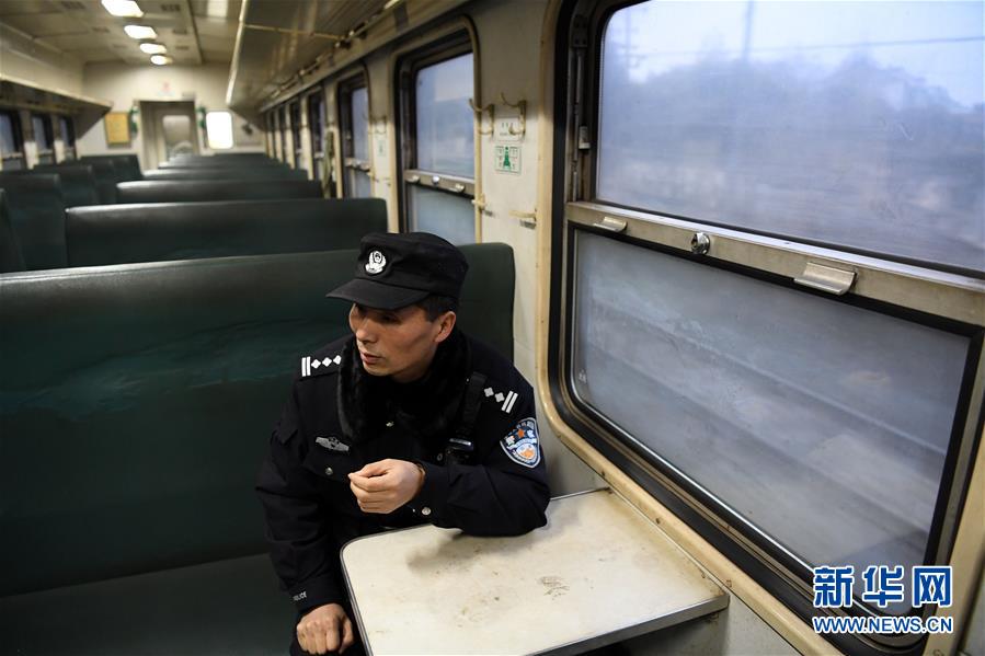 1月1日,在越南河内(嘉林)开往中国南宁的列车上,乘警杨铁鸣注视着车外。 新华社记者陆波岸摄