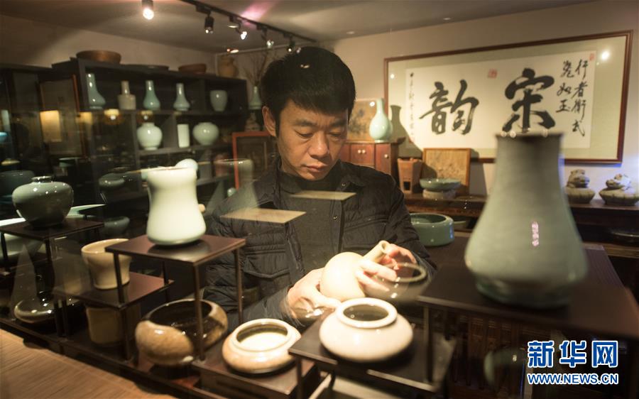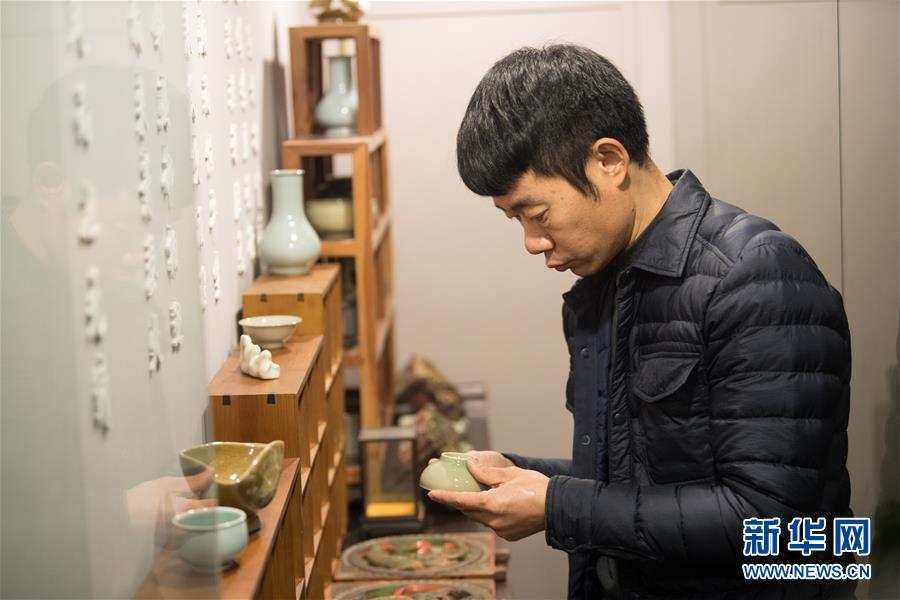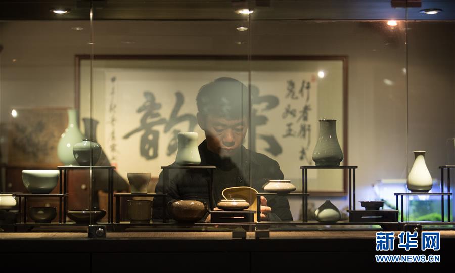 1月16日,陈卫武在“宋韵”展厅查看一件龙泉窑古器物。他收藏了一些古器物和残片,作为创作的参照。 新华社记者翁忻旸摄
