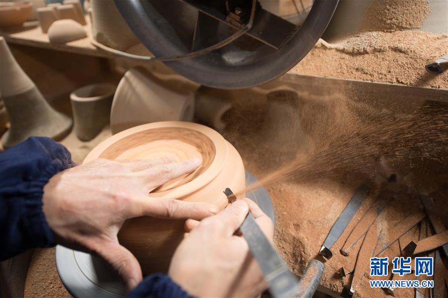 1月16日,陈卫武在工作室为一件青瓷洗修坯。 新华社记者翁忻旸摄