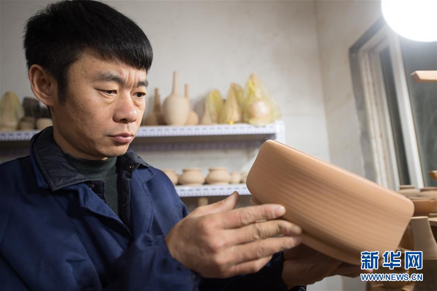 1月16日,陈卫武在工作室查看一件青瓷洗坯体的线条。 新华社记者翁忻旸摄