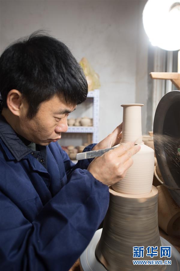 1月16日,陈卫武在工作室为一件青瓷瓶修坯。 新华社记者翁忻旸摄