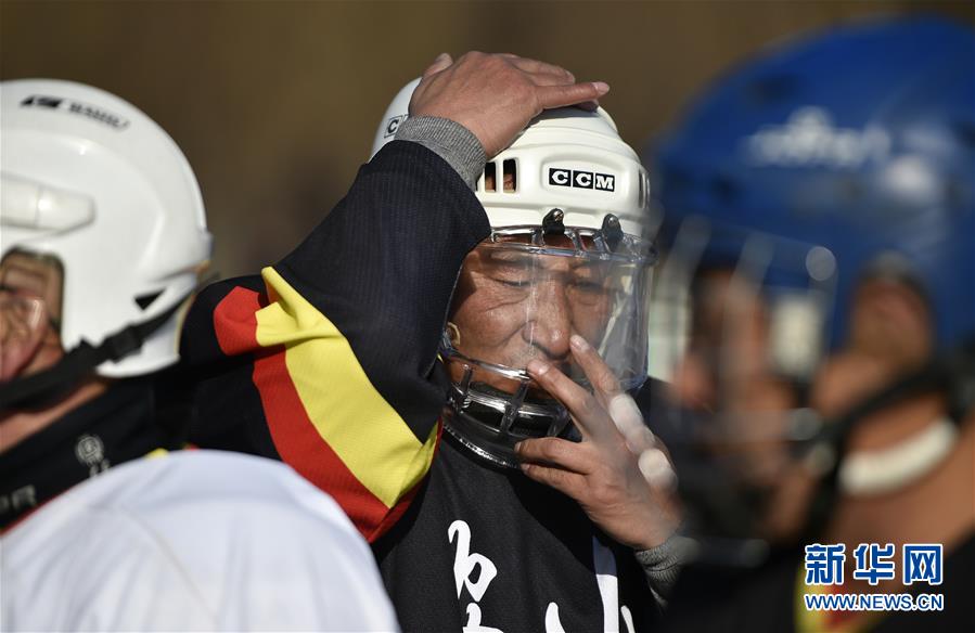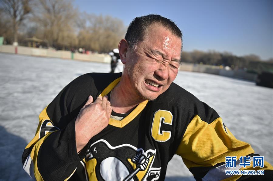 图为1月17日,队员刘殿国被冰球击中颈部,疼痛不已。