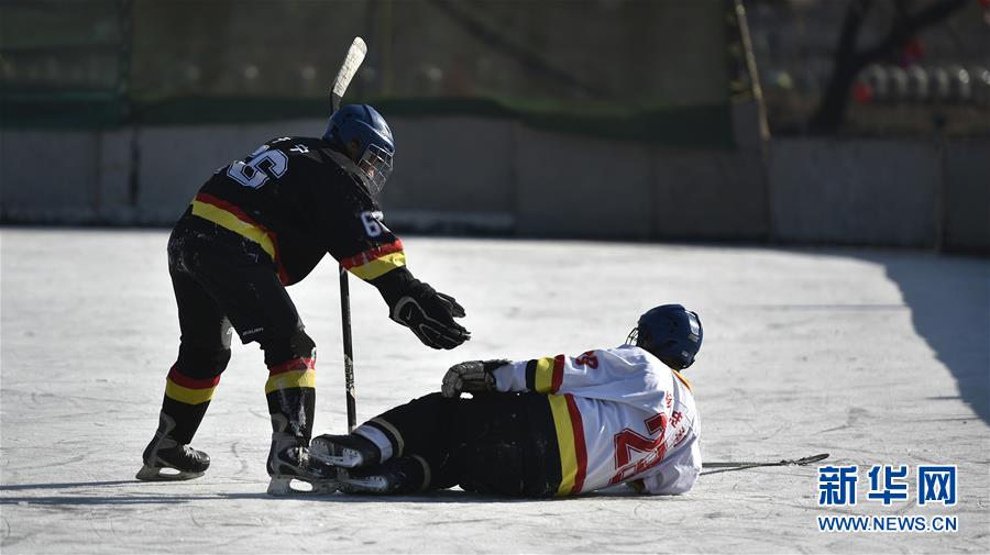 图为1月17日,冰球比赛中互相冲撞肯定少不了,队员于宁(左)准备拉起被他撞倒的队员杨忠利。