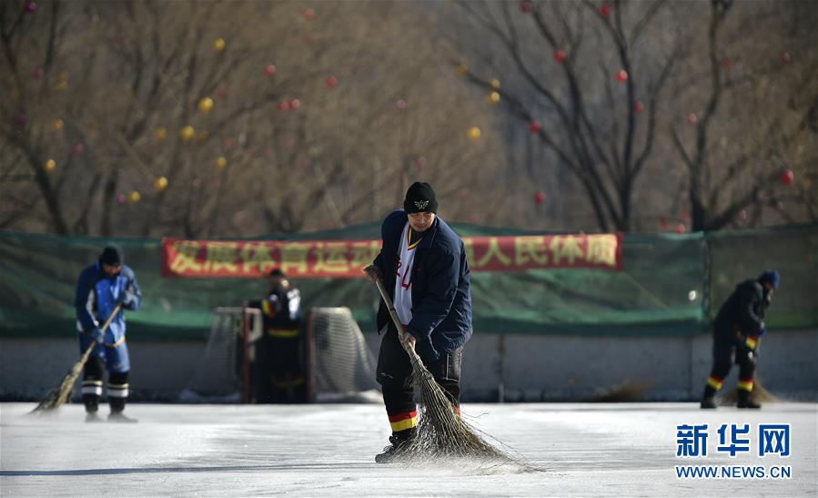 图为1月17日,队员李汉岭拉着自制的浇冰车,在冰面上浇冰。