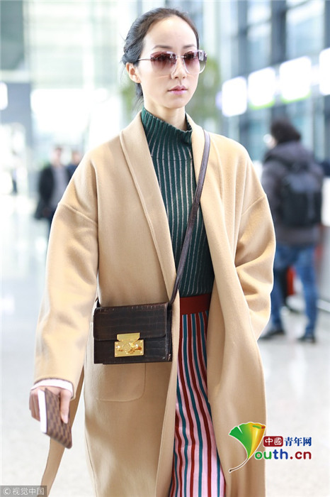 2019年1月17日,上海,韩雪现身机场,穿着条纹纱裙露出小腿,十分抗冻,她搭配经典的驼色大衣,气质出众在机场人群中相当抢镜。