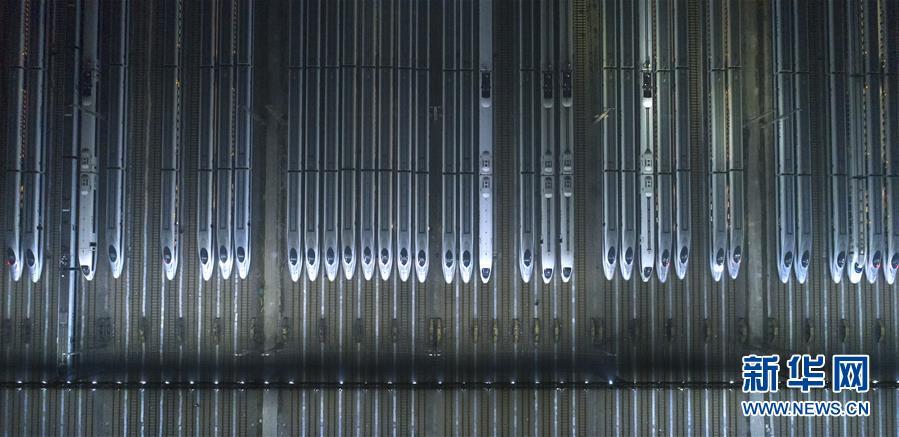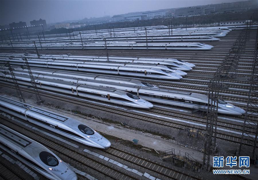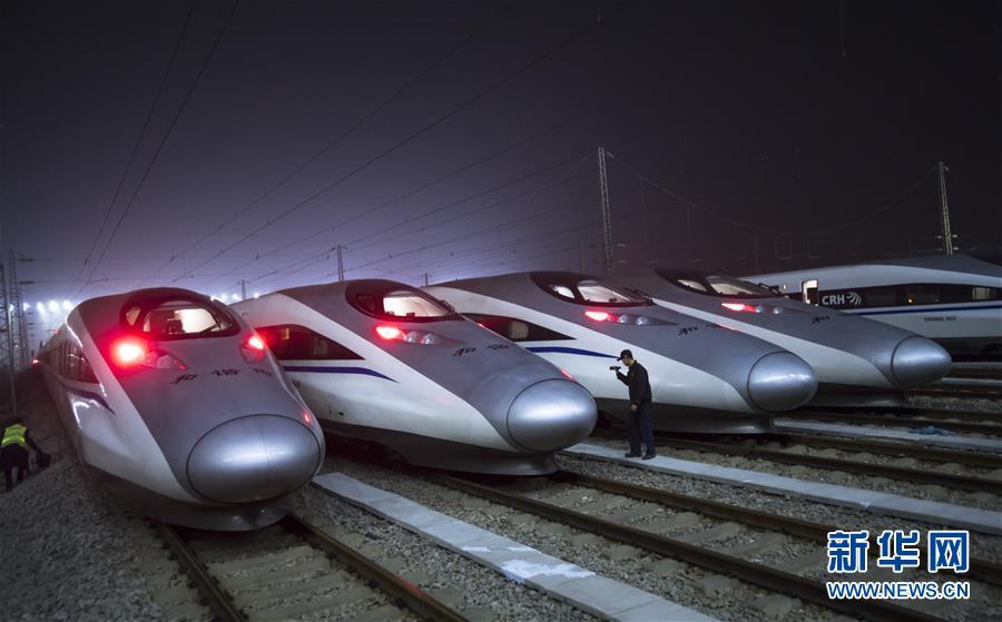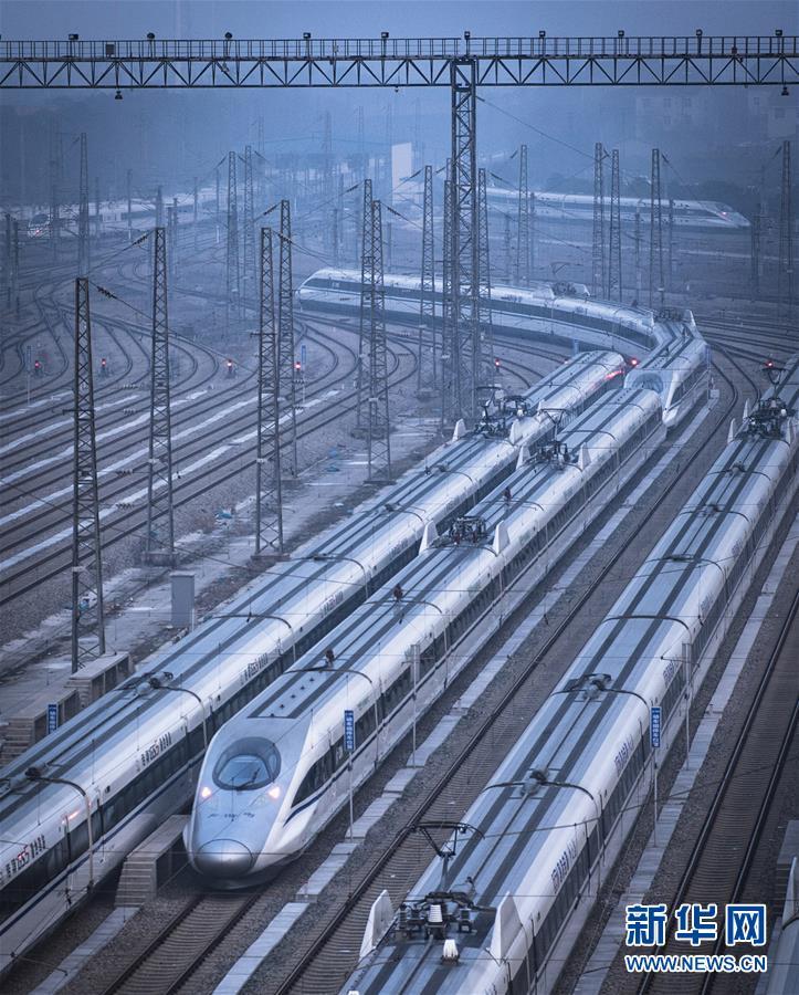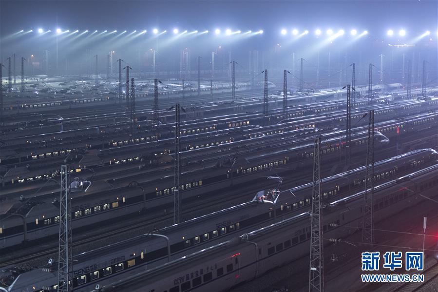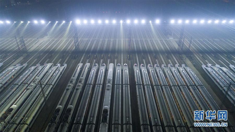 当日凌晨,近百组动车在武汉动车段通宵进行检修、保温作业后,在黎明时分出发,开启新一天的旅程。