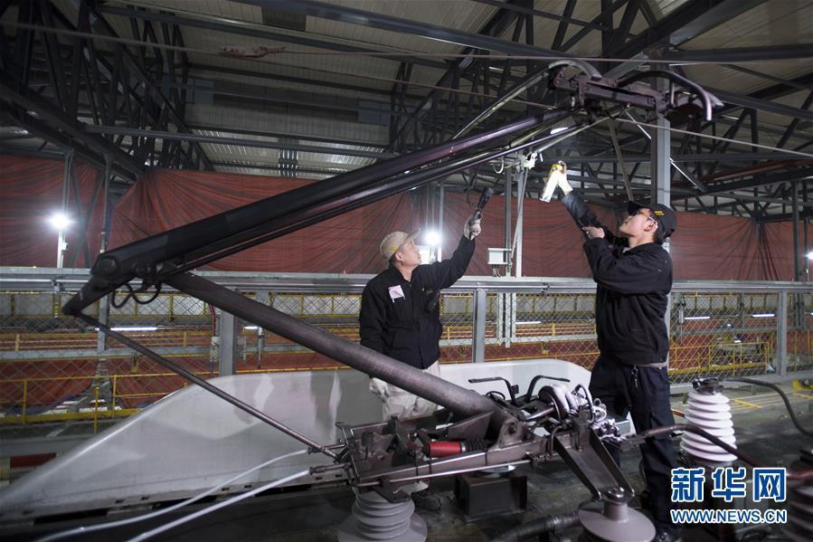 1月20日,武汉动车段工作人员在检修动车组列车的受电弓。