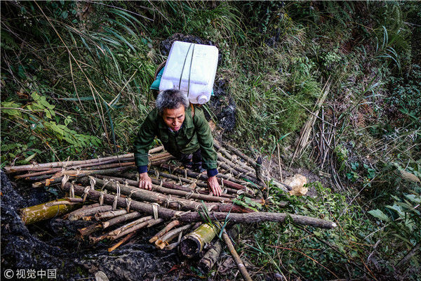 2018年12月21日,广西河池。去往戈英屯途中的悬崖处,有一个用藤条和枝干架起来的木梯,如果没有它,村民将难以进山。