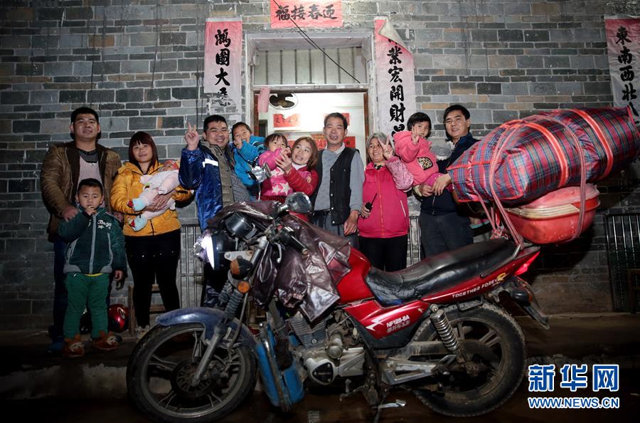 2017年1月19日夜,在广东佛山务工的陈一锋(右八)、徐丽宁(右五)夫妇,经过近14个小时的摩托车骑行,回到广西藤县同心镇平顶村乌石组家中,一家人在门前合影。