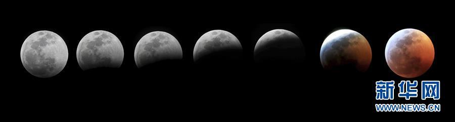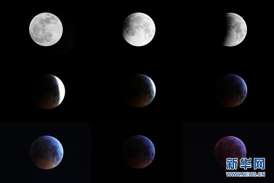 这是1月20日在美国洛杉矶拍摄的“超级红月亮”月全食过程(拼版照片)。 1月21日迎来2019年第一个月圆之夜,新年首次“超级月亮”现身天宇。巧合的是,当日还发生一场“月全食”奇观。因此,这一天的月亮也被称为“超级红月亮”。 新华社记者 李颖 摄