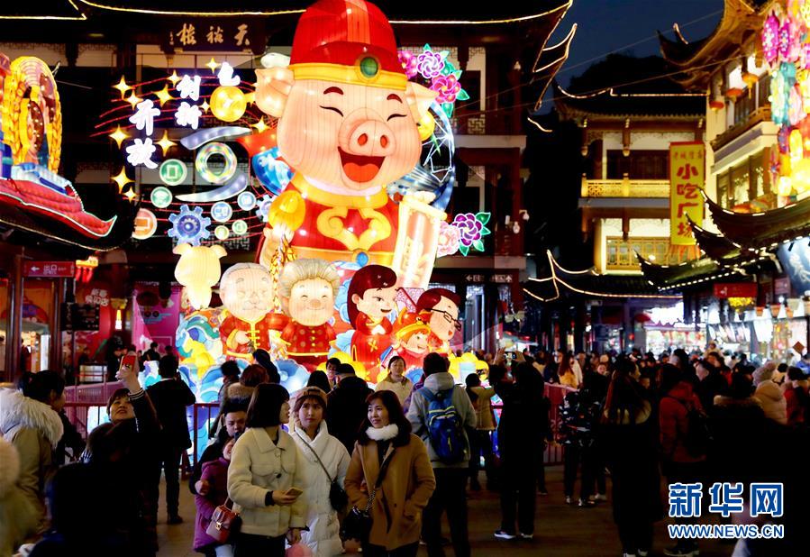 1月21日晚,今年的主题灯组——高约9米、憨态可掬的卡通财神猪手捧福袋和金元宝,向市民和游客送上新春的祝福。 当晚,2019年豫园新春民俗艺术灯会正式亮灯。本届灯会将持续至2月22日,为期33天,预计将迎来数百万海内外游客赏灯迎新。 新华社记者 刘颖 摄