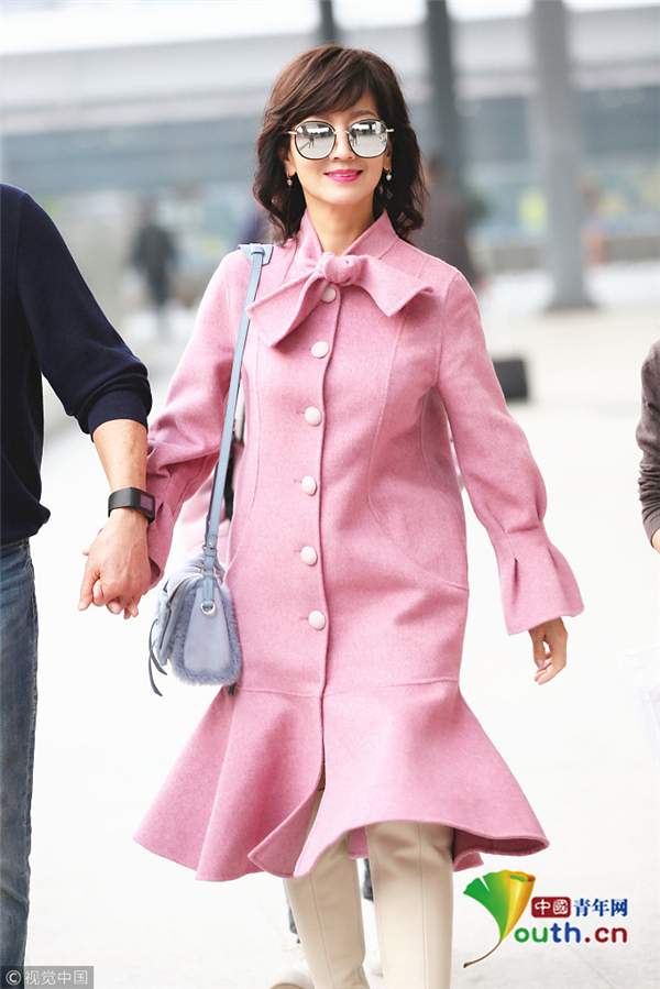 赵雅芝着粉嫩鱼尾大衣优雅甜美 获老公一路牵手