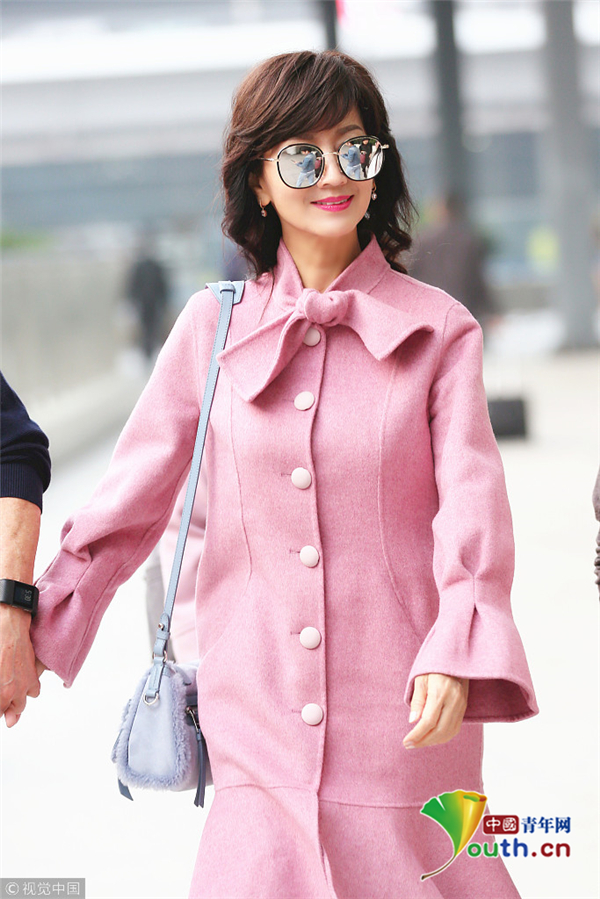 赵雅芝着粉嫩鱼尾大衣优雅甜美 获老公一路牵手