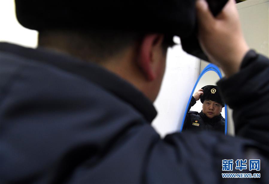 1月22日,李翔在接发列车作业前按照作业标准整理仪容仪表。新华社记者李安摄